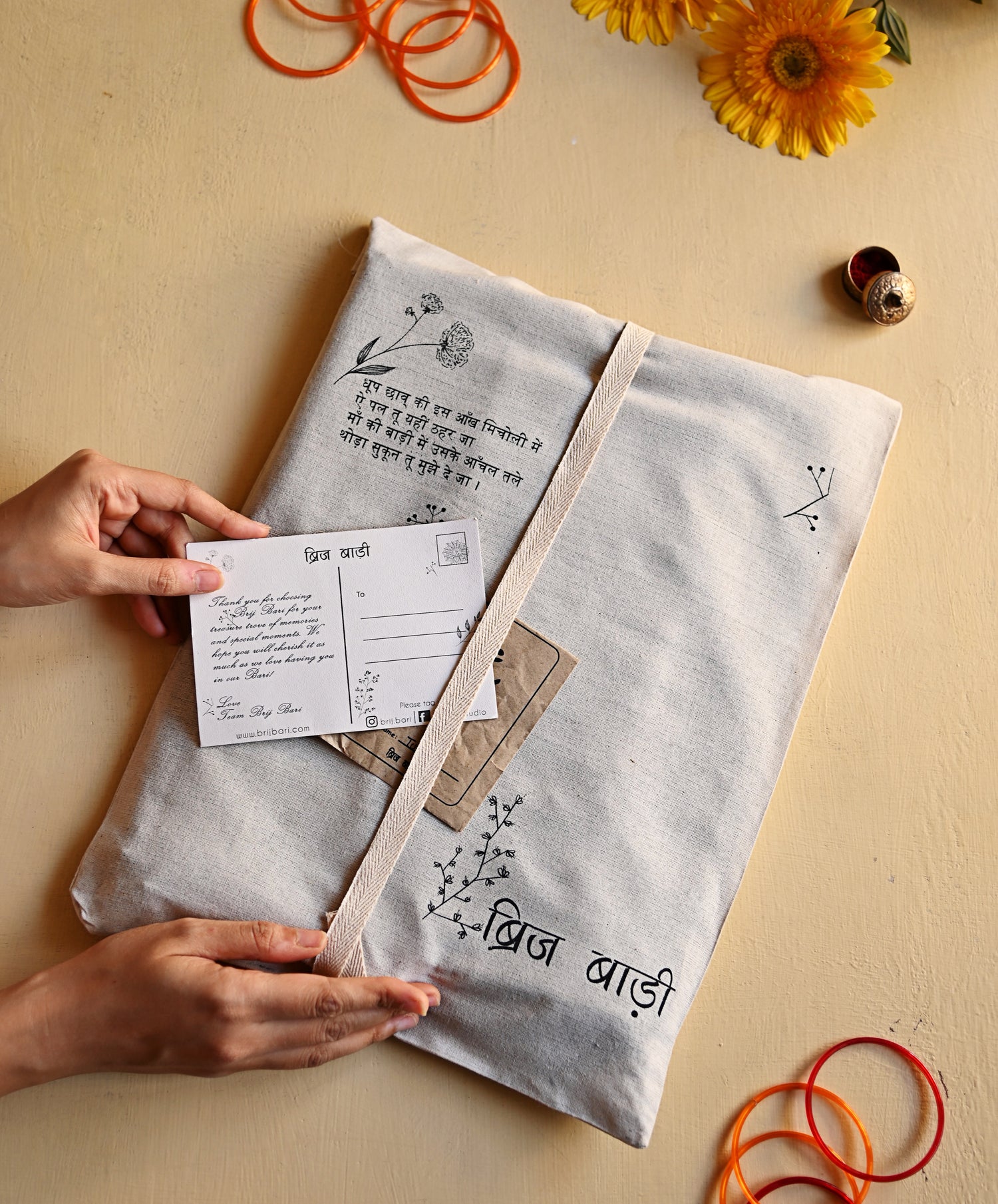 Your beautiful sarees and dupattas are wrapped with love and care in soft cotton bags. Let love grow with the beauty of handwritten note and Tulsi seeds everytime you shop with us!